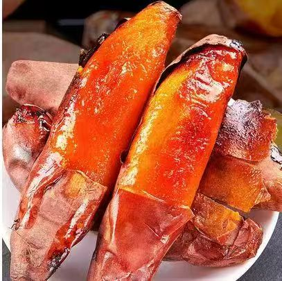 (二)红瑶蜜薯:深酒红色薯皮下橙黄薯肉鲜亮,单薯重300-500克,敲击声清脆。经60天糖化后,糖度40-50度,沙糯绵密如榴莲,带淡淡奶香与果香,无筋无丝入口即化。含有非常多的维生素A、β-胡萝卜素及膳食纤维,钾元素丰富,淀粉含量春薯27%以上,夏薯达21%。采用脱毒一代原种种苗,160天自然生长,拒绝催熟,蒸烤后甜度提升,可制蜜薯糖水、小丸子等甜品。